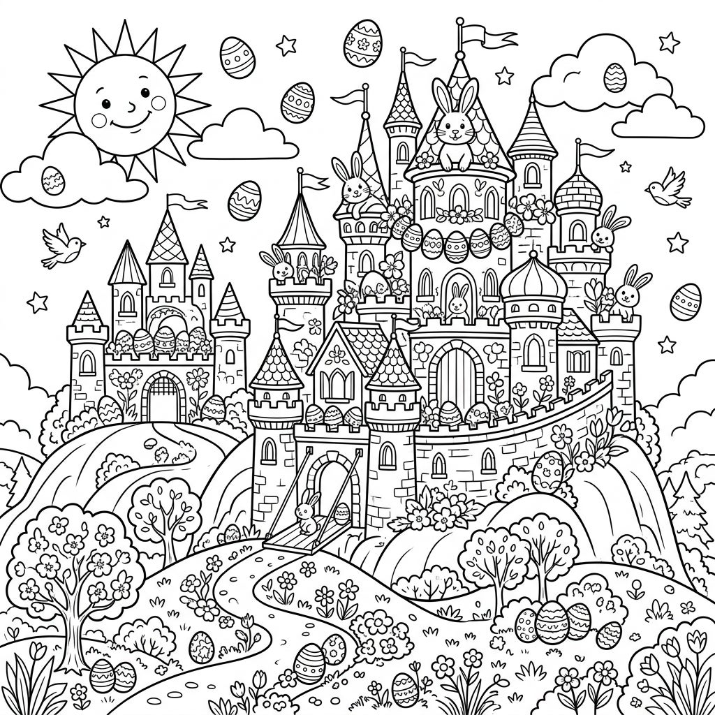 Step into a fairytale landscape with this captivating coloring page, showcasing a grand hilltop castle transformed for an unforgettable Easter celebration. Intricate turrets, sturdy walls, and charming arched windows define the majestic fortress, while adorable Easter bunnies peek out from every corner, adding a touch of playful magic. Look closely to find countless decorated Easter eggs nestled among spring blossoms, dotting the castle's facade and sprawling across the rolling hills below.