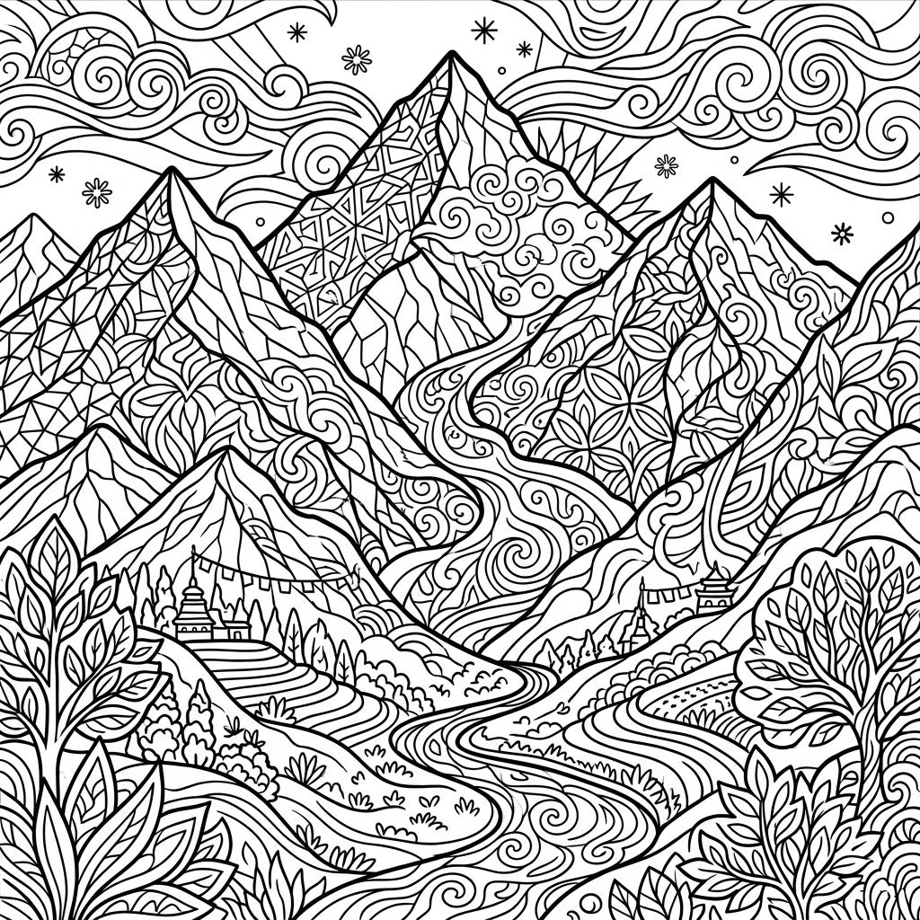 Immerse yourself in the breathtaking beauty of the Himalayan Mountains with this exquisitely detailed adult coloring template. This intricate design brings to life a majestic mountain range, where each peak and valley is adorned with a rich tapestry of swirling, geometric, and organic patterns. A serene river gracefully winds its way through the landscape, flanked by stylized trees and hints of traditional structures, inviting you to explore every fine line and shape.