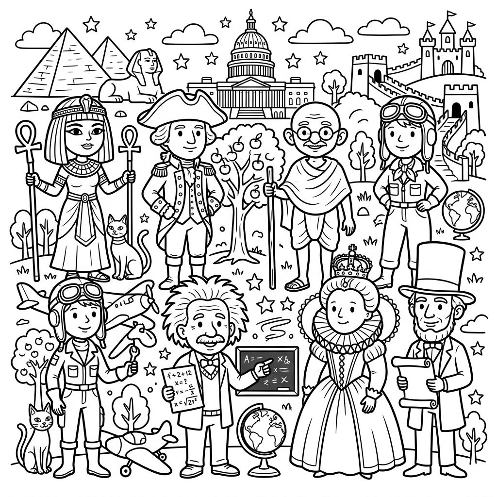 Dive into a vibrant historical panorama designed specifically for young learners! This captivating coloring page brings together an incredible assembly of historical figures, each rendered with clear, friendly outlines perfect for little hands. Spot Cleopatra with her ankhs, George Washington in his Revolutionary War attire, the peaceful Mahatma Gandhi, and the brilliant Albert Einstein with his formulas. Aviators like Amelia Earhart, the regal Queen Elizabeth I, and the iconic Abraham Lincoln also stand proudly among them, all set against a backdrop featuring world-famous landmarks such as the Egyptian pyramids, the US Capitol, and the majestic Great Wall of China.