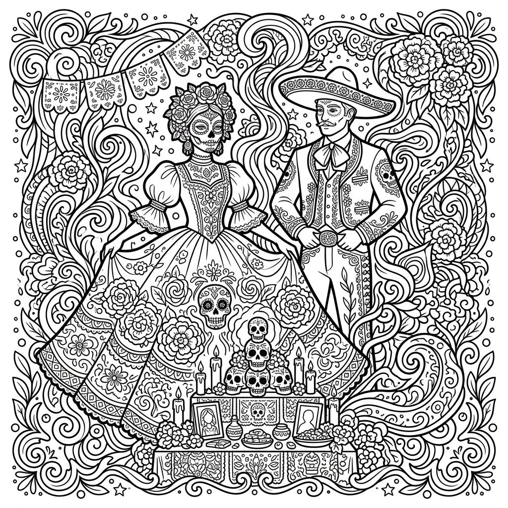 Step into a world where ancient traditions meet mind-bending artistry with this 'History & Cultures x Day of the Dead x Psychedelic' coloring page. This intricate design features a beautifully depicted couple in elaborate historical attire, their faces adorned with calavera makeup, surrounded by a captivating swirl of patterns. Observe the rich details in the woman's flowing dress, decorated with sugar skulls and blossoming flowers, and the man's distinguished charro suit. Below them, a reverent altar holds offerings, candles, and stacks of ornate sugar skulls, all framed by dynamic, organic shapes and intricate floral motifs that create a truly immersive visual experience.