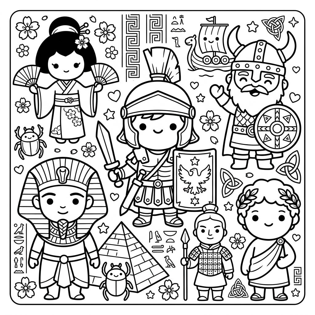 Embark on an enchanting historical journey with this unique coloring page, where the grandeur of ancient civilizations meets the irresistible charm of Kawaii art. This intricate design features a delightful cast of characters, including a cheerful Egyptian pharaoh, a brave Roman centurion, a mighty Viking warrior with his longboat, an elegant Japanese woman, a disciplined Chinese soldier, and a wise ancient Greek figure. Each character is rendered with thick, bold outlines and simple, adorable faces, surrounded by iconic cultural symbols like pyramids, hieroglyphs, scarab beetles, cherry blossoms, Celtic knots, and classical Greek patterns, all waiting for your artistic touch.