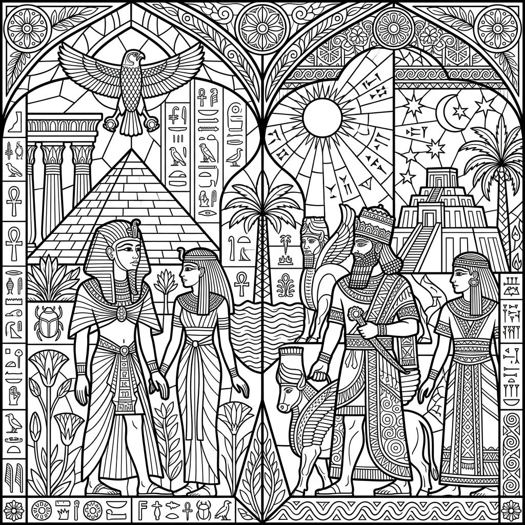 Unravel the mysteries of ancient Egypt and Mesopotamia with this stunning stained glass coloring page designed for adults. Featuring iconic symbols, rulers, and structures, it offers a deeply engaging artistic escape.