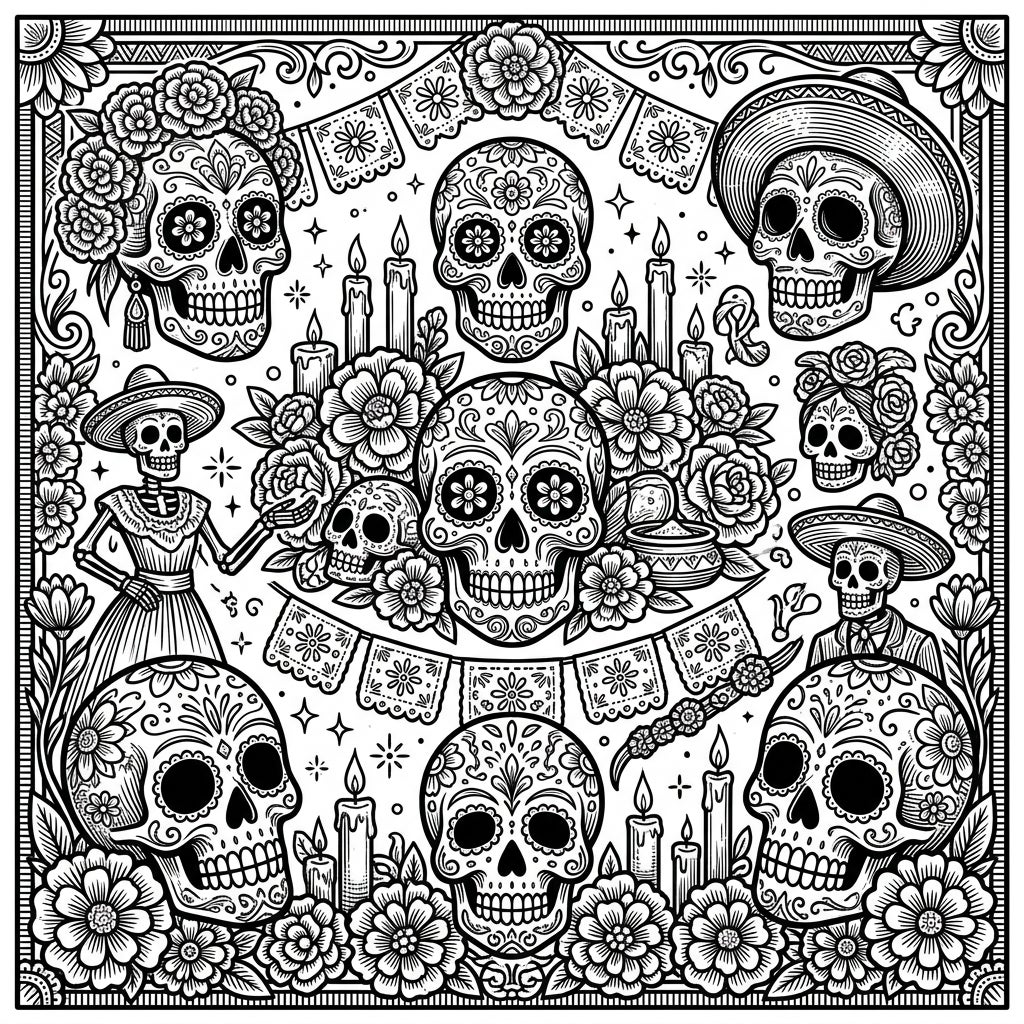 Step into a rich tapestry of cultural celebration with this stunning Day of the Dead coloring page. This intricate design showcases a vibrant array of calaveras, or sugar skulls, each adorned with unique floral patterns, delicate swirls, and traditional motifs. Surrounded by flickering candles, blooming marigolds, and festive 'papel picado' banners, the scene captures the heart of this revered Mexican tradition. Look closely to discover charming skeleton figures in traditional attire, adding to the detailed narrative, all framed by an exquisite decorative border.