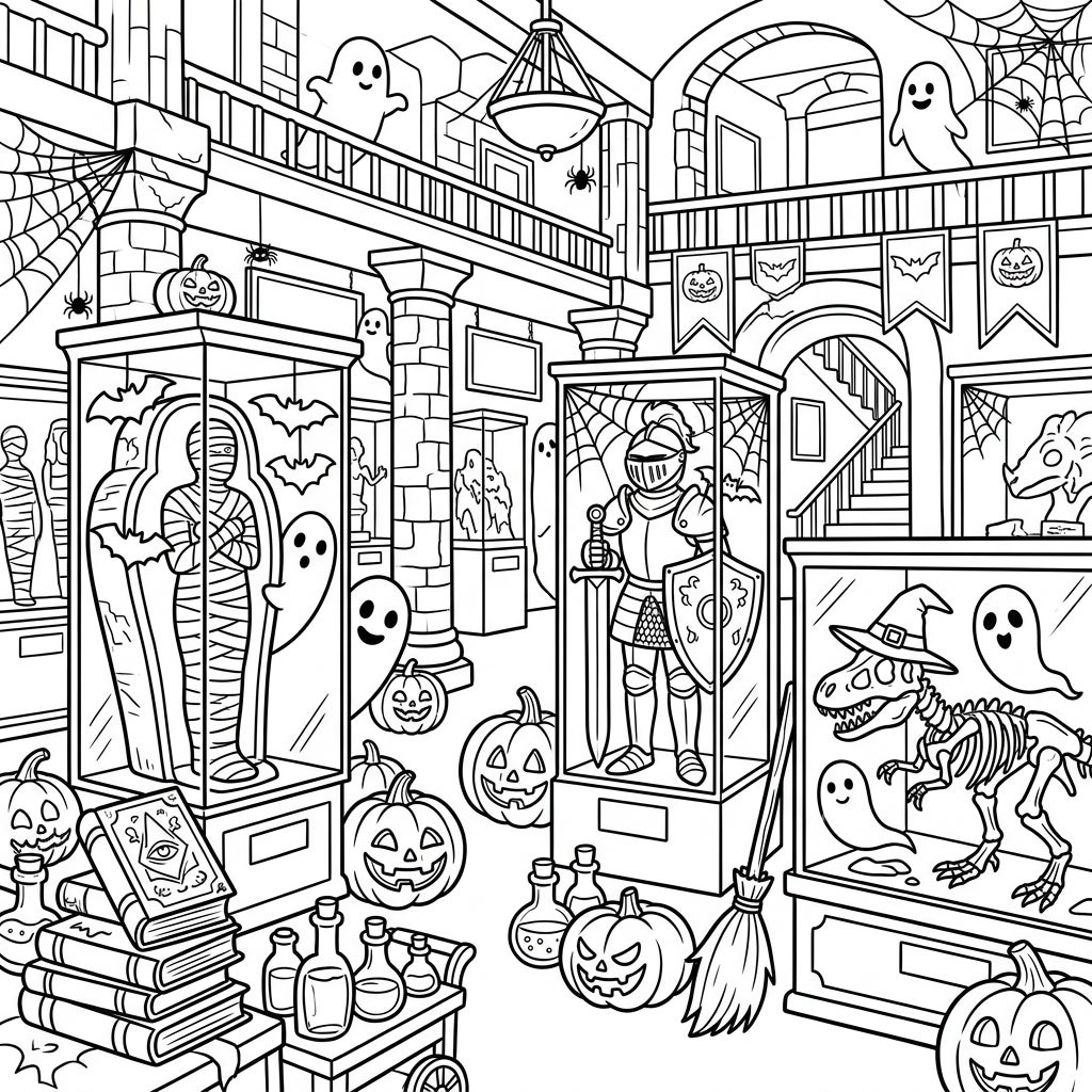 Step into a world where ancient history meets spooky Halloween fun with this captivating coloring page. Discover a museum filled with ghoulish delights, from mummies to dinosaur skeletons, all ready for your creative touch.