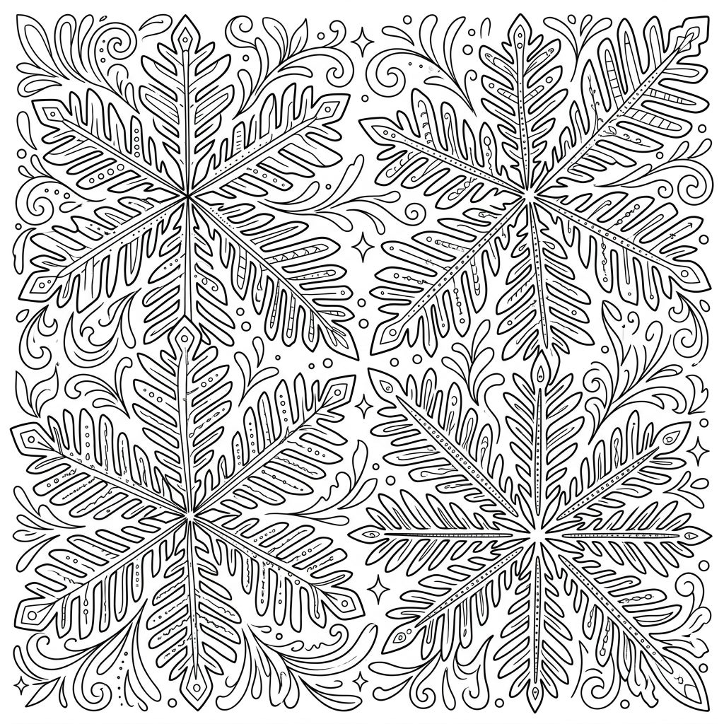 This captivating coloring page presents a stunning array of four large, snowflake-like formations, each exquisitely detailed with the unique artistry of Zentangle patterns. Within the broad, feathery arms of these ice crystal motifs, you'll discover a mesmerizing world of repetitive lines, tiny dots, and delicate swirls, inviting you to lose yourself in their complex beauty. The entire composition fills the page, ensuring an immersive experience where every corner holds a new detail to explore and bring to life with your chosen colors.