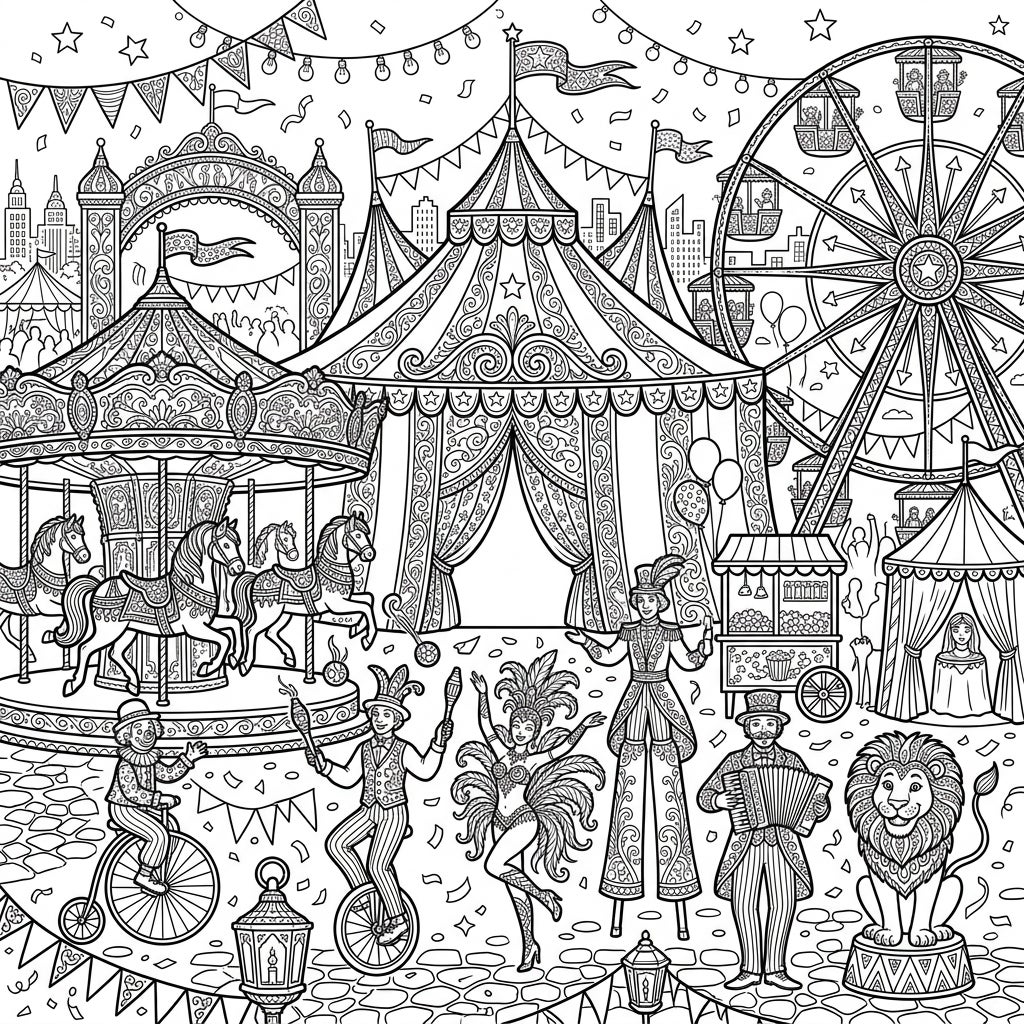 Unleash your inner artist by bringing this Holiday & Event carnival scene to life. Experiment with bold, vibrant colors for the performers' costumes and fairground attractions, or opt for a vintage palette to evoke a nostalgic charm. This intricate template is designed for adults seeking stress-relief and mindfulness, offering countless small details to focus on and transform into a personalized masterpiece.