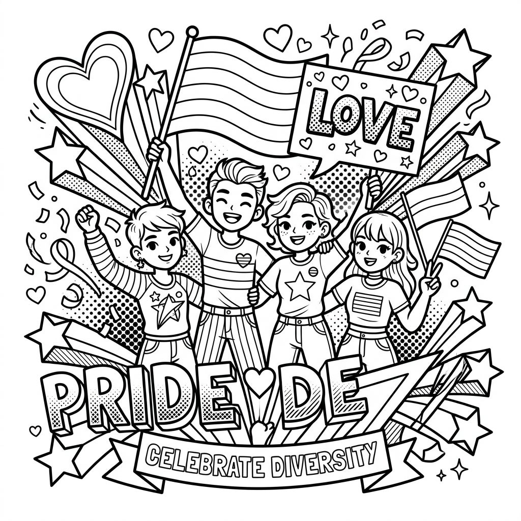 Step into a world of vibrant expression with this festive Pop Art coloring page, dedicated to celebrating Pride Month. This dynamic design features a group of four diverse and cheerful individuals, each radiating joy as they hold high rainbow flags and signs proclaiming 'LOVE.' The scene bursts with energy, surrounded by an explosion of stars, hearts, and confetti, all rendered with the signature bold outlines and striking halftone dot patterns characteristic of the Pop Art aesthetic. At the forefront, the word 'PRIDE' stands out in prominent, block letters, underscored by a banner inviting you to 'CELEBRATE DIVERSITY'.
