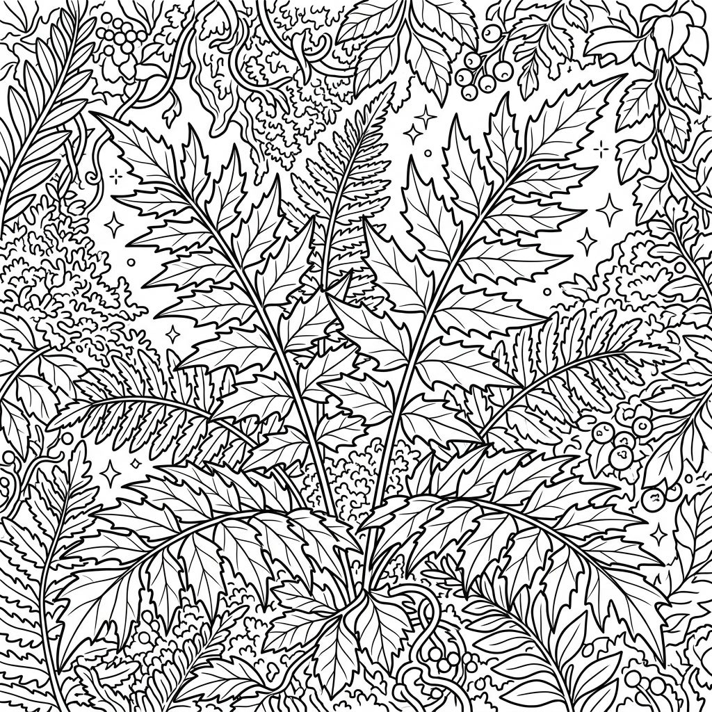 Dive into the intricate details of a full scene botanical illustration featuring elegant holly ferns and lush foliage. This complex design offers a truly immersive coloring experience for nature lovers.
