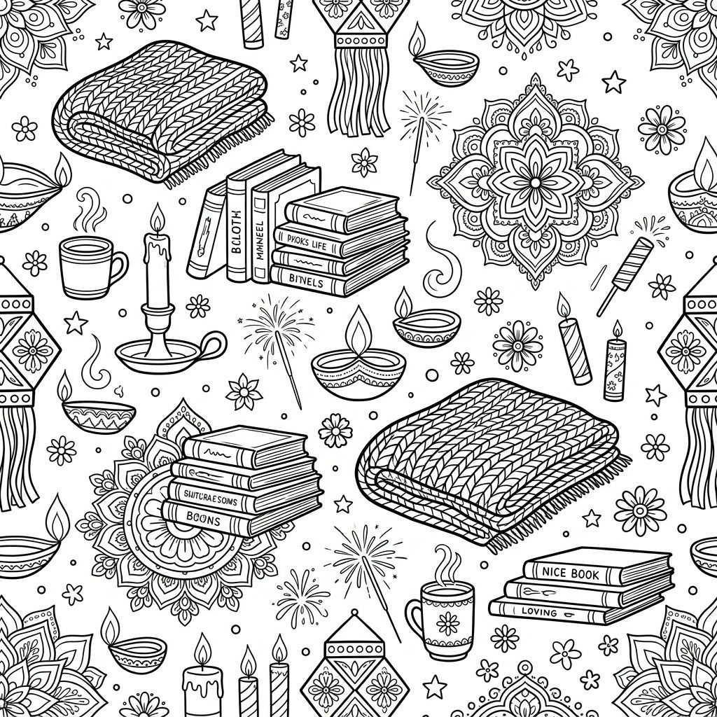 This captivating seamless pattern coloring page beautifully marries the serene comfort of home with the vibrant spirit of Diwali. Observe the charming details woven throughout: soft knitted blankets inviting warmth, stacks of beloved books promising quiet moments, and steaming mugs perfect for a cozy beverage. These comforting elements are elegantly intertwined with traditional Diwali decor, showcasing lit diyas, intricately detailed mandala-like rangoli patterns, decorative lanterns, and cheerful sparklers.