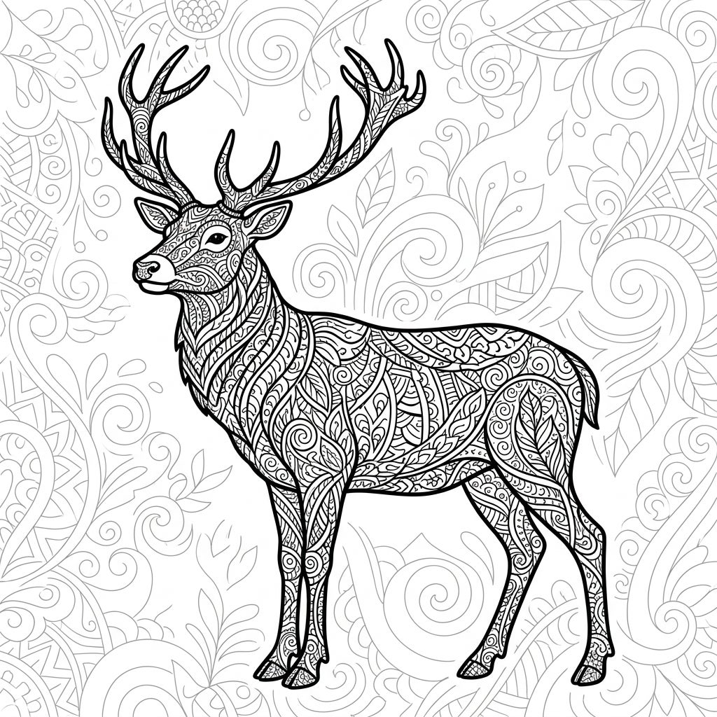 Step into a world of intricate beauty with our captivating Zentangle Deer coloring page. This stunning design showcases a magnificent deer, complete with impressive antlers, standing gracefully. Every inch of its form, from its strong legs to its noble head, is adorned with a mesmerizing array of swirling lines, organic shapes, and repetitive patterns characteristic of the Zentangle art form. The detailed background, mirroring the animal's elaborate design, creates a cohesive and immersive scene, inviting you to explore every delicate curve and stroke.
