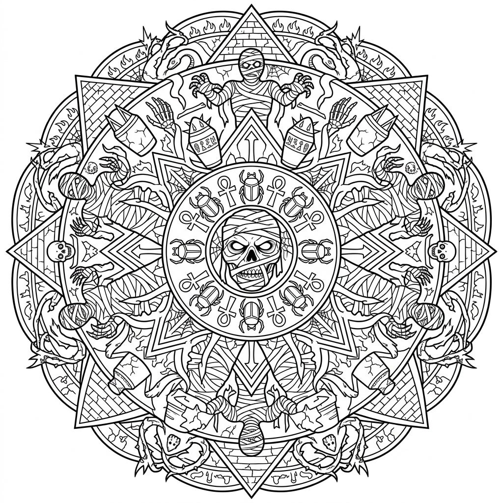 Perfect for those who delight in the macabre and the mysterious, this mandala captures the chilling essence of ancient Egyptian folklore and horror films. Imagine the silent footsteps of mummies emerging from forgotten tombs, their curses echoing through time. This page is an ideal creative escape for Halloween, a spooky-themed art night, or simply whenever you crave a touch of ancient terror in your coloring. Let the intricate lines transport you to a world of forgotten rituals and reanimated guardians.