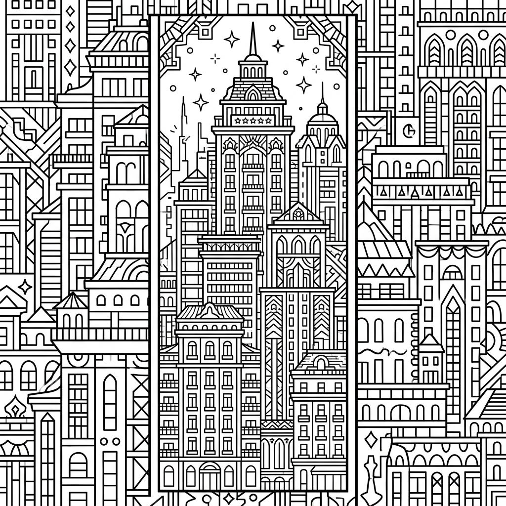 This coloring template transports you to the heart of a vibrant metropolis, offering a chance to appreciate the grandeur and complexity of urban architecture. It evokes the feeling of a peaceful escape into a detailed world, where the rhythmic lines and varied textures invite a sense of calm focus. Whether you dream of city lights or simply enjoy the challenge of intricate patterns, this bookmark provides a perfect artistic outlet to unwind and express your creativity, turning a plain outline into a colorful cityscape.