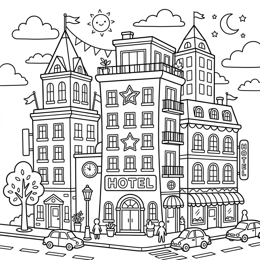 What colors will you choose for your bustling city? Will the hotel be a vibrant red, a cool blue, or a classic beige? Don't forget to color the fluffy clouds and decide if it's a bright sunny day with the smiling sun or a magical night with the crescent moon and sparkling stars! Grab your crayons, markers, or colored pencils and embark on an artistic adventure, transforming this black-and-white outline into a colorful, lively city scene that's uniquely yours.