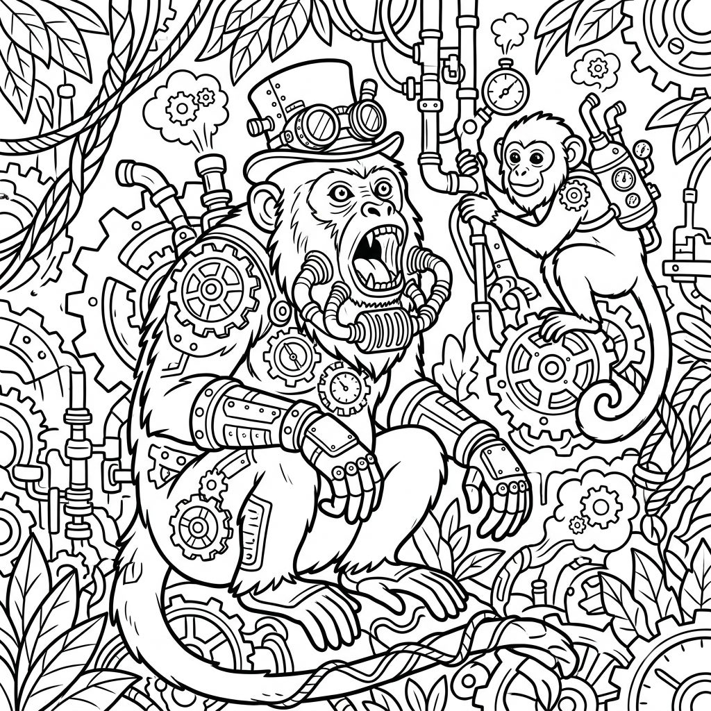 Journey into a fantastical jungle where majestic howler monkeys are reimagined with an intricate Steampunk aesthetic. This captivating coloring page perfectly blends natural power with retro-futuristic marvels, offering an exciting challenge for colorists.