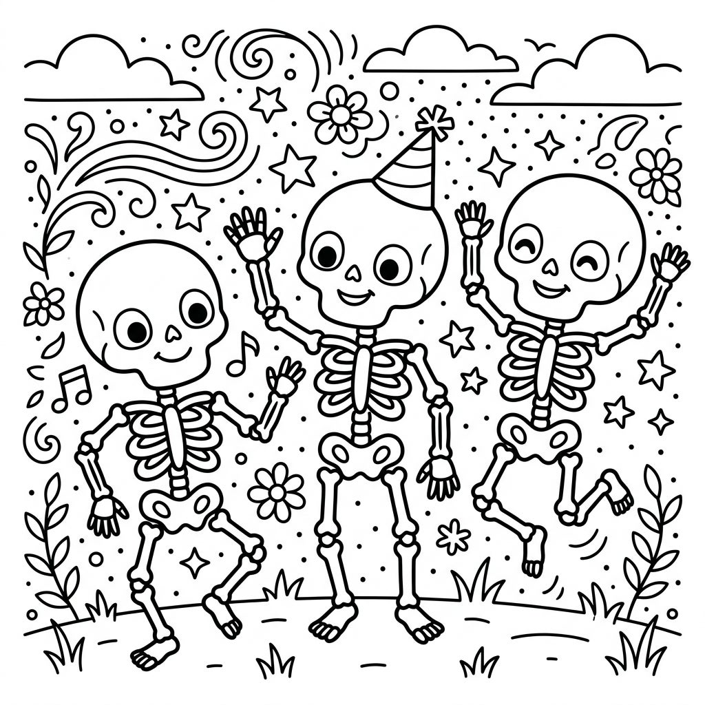 Step right up for a boogie with our delightful skeleton coloring page, perfect for young artists! This playful scene features three friendly cartoon skeletons, each with big, round eyes and wide smiles. One skeleton is ready to celebrate with a festive party hat, while the others are caught in joyful dancing and waving poses, inviting your child to join the fun.
