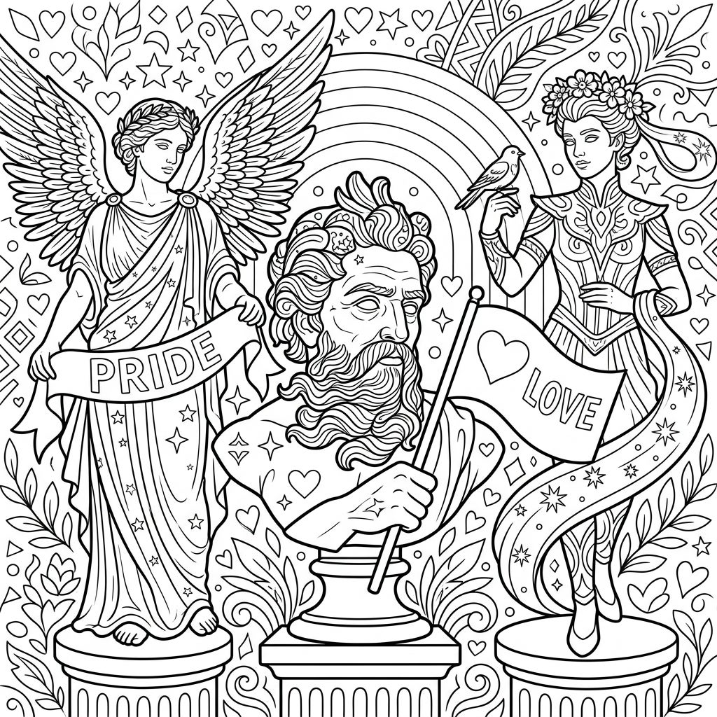 Step into a world where classical art meets vibrant celebration with this intricate coloring page. Dominating the scene are three majestic humanoid sculptures, each resting on an ornate pedestal. On the left, a graceful winged figure, reminiscent of an angel or goddess, proudly unfurls a banner inscribed with 'PRIDE'. At the center, a wise, bearded bust, evoking ancient philosophers or deities, steadfastly holds a flag bearing a heart and the powerful word 'LOVE'. To the right, a serene female figure adorned with a delicate floral crown cradles a small bird, her elegant attire adding to the tableau of beauty. The entire composition is enveloped in a rich tapestry of background patterns, featuring a prominent rainbow arch, joyful hearts, twinkling stars, and lush botanical elements, ensuring a deeply engaging coloring experience.