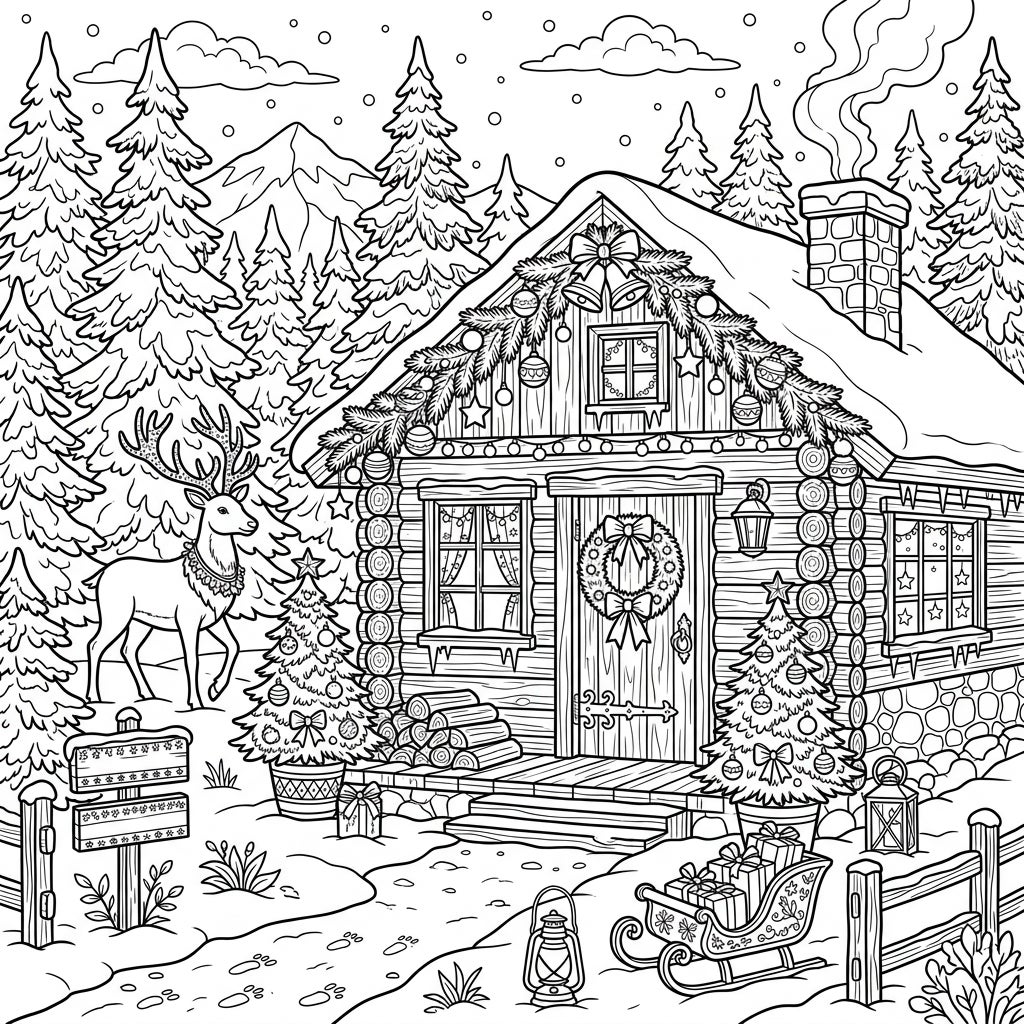 Journey into a detailed winter scene with this charming coloring page, showcasing a rustic hunting cottage nestled deep within a snowy forest. Every element is brimming with festive cheer, from the intricate garland adorning the roof and doorway, complete with bells and ornaments, to the welcoming Christmas wreath on the front door. Look closely to spot the stacks of firewood, inviting lanterns, and a decorated signpost, all contributing to the cozy ambiance of this holiday retreat. A majestic reindeer stands gracefully nearby, while a sleigh overflowing with beautifully wrapped gifts awaits on the snow-laden path.