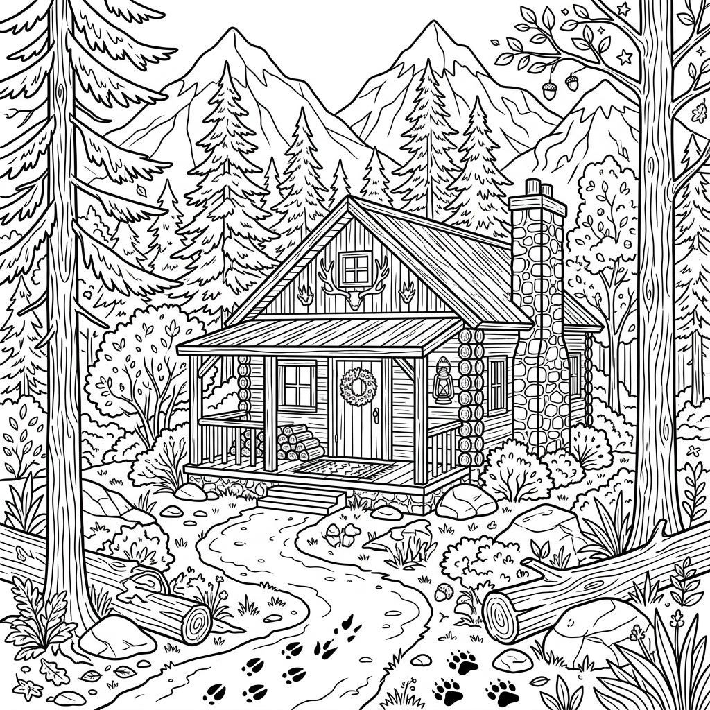 Surrounding this cozy retreat are towering pine trees, majestic mountains in the background, and a lush forest floor dotted with fallen logs and varied foliage. A winding path, marked with intriguing animal paw prints – both canine and feline – leads up to the cottage, inviting you on an imaginary journey deep into nature. This scene perfectly captures the spirit of a secluded forest hideaway, offering a peaceful escape for coloring enthusiasts.