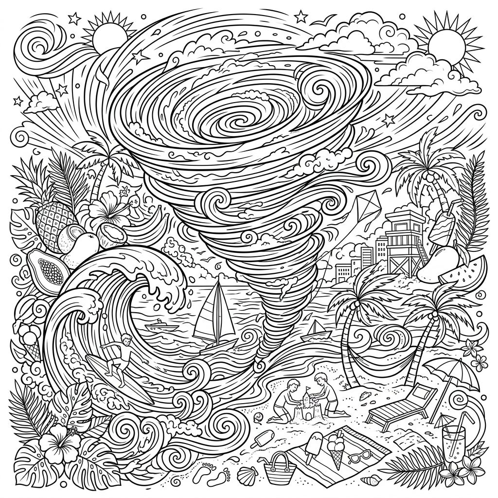 Unleash your creativity with this extraordinary coloring page, blending the dynamic energy of a hurricane with the blissful essence of a summer vacation. Discover a world where swirling winds meet sunny beaches, tropical fruits, and endless fun.