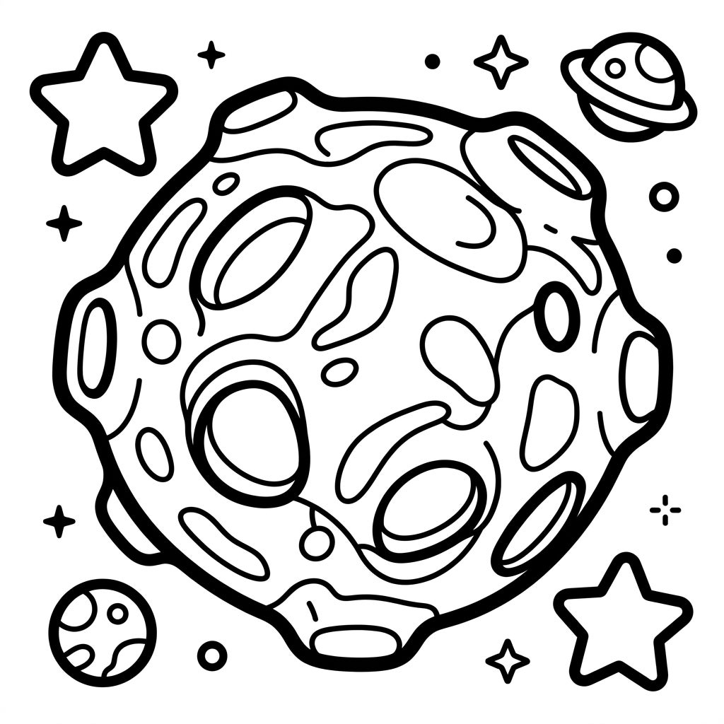 Journey into the cosmos with our delightful Hygiea Asteroid coloring page, specially crafted for toddlers! This template features a wonderfully large and friendly asteroid, dominating the scene with its clear, thick outlines and numerous craters. Surrounding our celestial friend are whimsical, oversized stars and adorable mini-planets, all designed with bold lines and expansive spaces perfect for little hands to fill with their favorite colors.