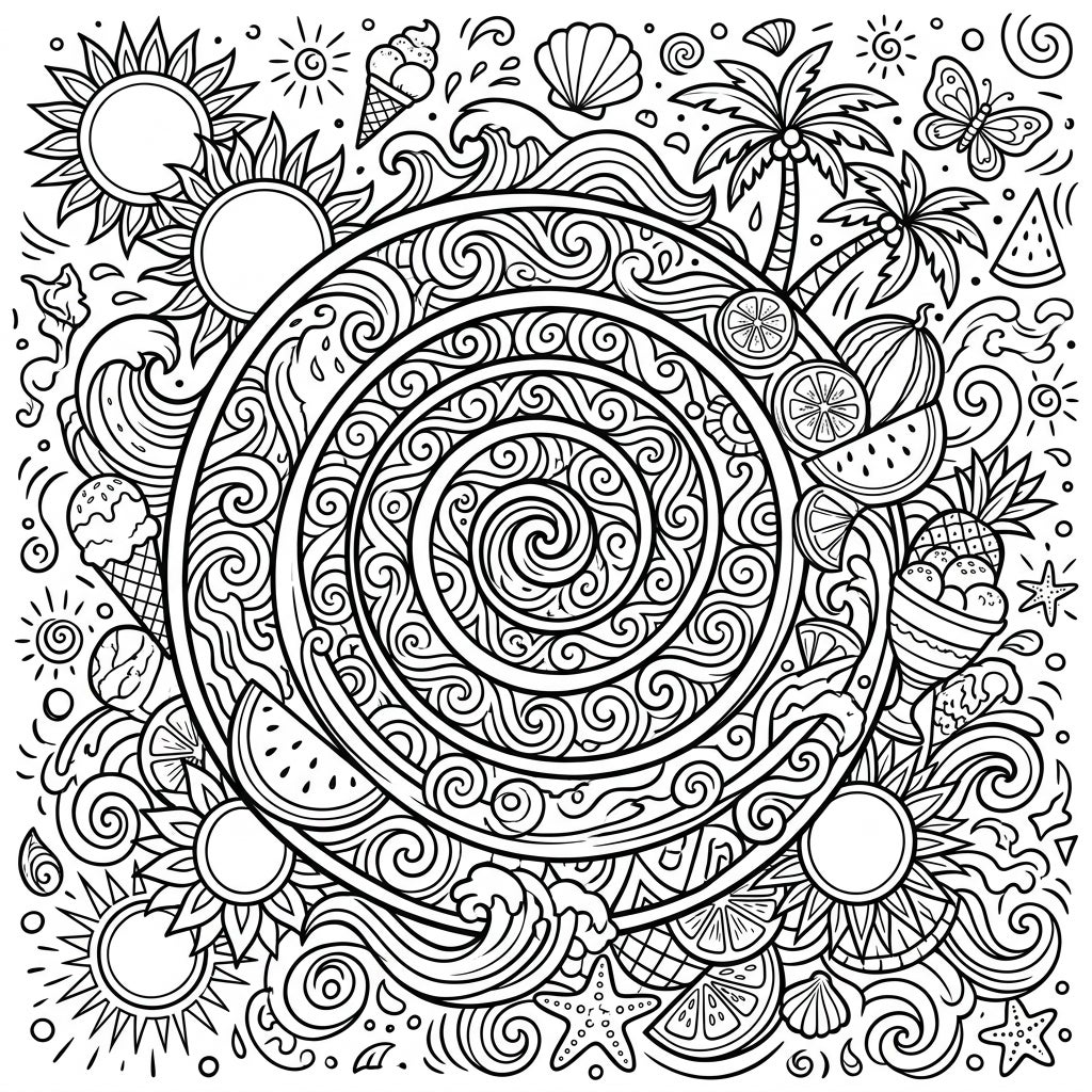 Immerse yourself in a world of intricate beauty with this hypnotic spiral coloring page, bursting with summer delight. A magnificent, detailed spiral pattern takes center stage, creating a mesmerizing optical illusion that invites you to lose yourself in its swirling depths. Around this captivating core, a rich tapestry of summer icons unfolds – from radiant suns and playful ocean waves to delicious ice cream cones, refreshing watermelon and citrus slices, and even towering palm trees swaying in a gentle breeze. Every element is crafted with precision, offering a dense and rewarding coloring experience.