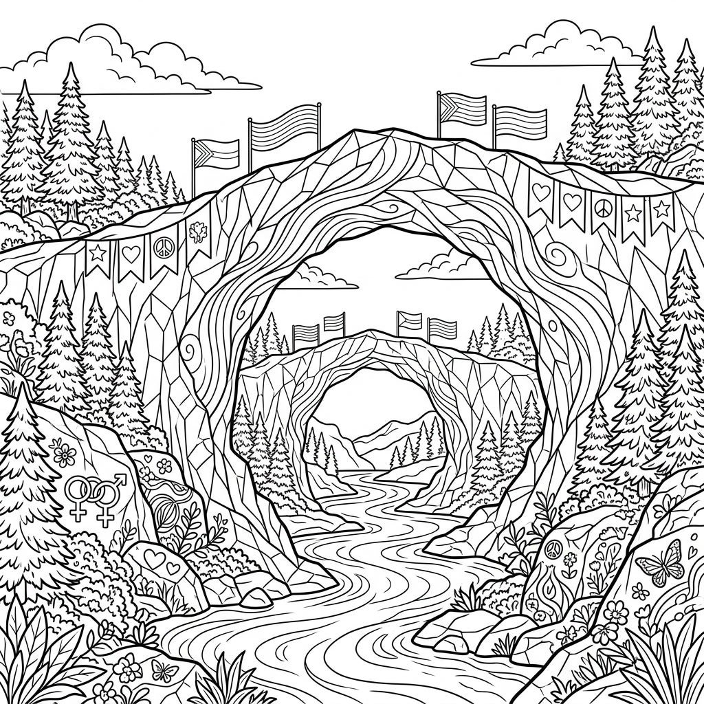This captivating coloring page is a vibrant celebration of Pride Month, merging the awe-inspiring power of nature with messages of love, diversity, and acceptance. The enduring ice bridges represent strength and connection, while the flowing river symbolizes life's journey and fluidity. It's a wonderful way to honor the spirit of Pride by bringing a scene of unity and natural splendor to life through your artistic touch.