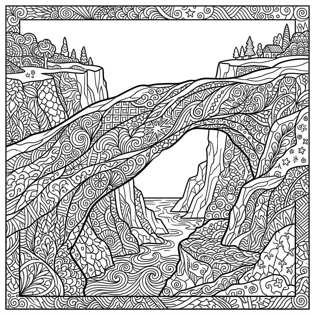 Unleash your creativity with this exquisite Zentangle ice bridge coloring page. This captivating design showcases a grand natural arch gracefully spanning a tranquil body of water, connecting two rugged landmasses. Every element, from the colossal bridge structure to the towering cliffs, the flowing river, and even the distant trees and tiny house perched on the horizon, is intricately detailed with a rich tapestry of high-density, repetitive abstract patterns. The entire scene is framed by an ornate patterned border, inviting you into a world of complex beauty.
