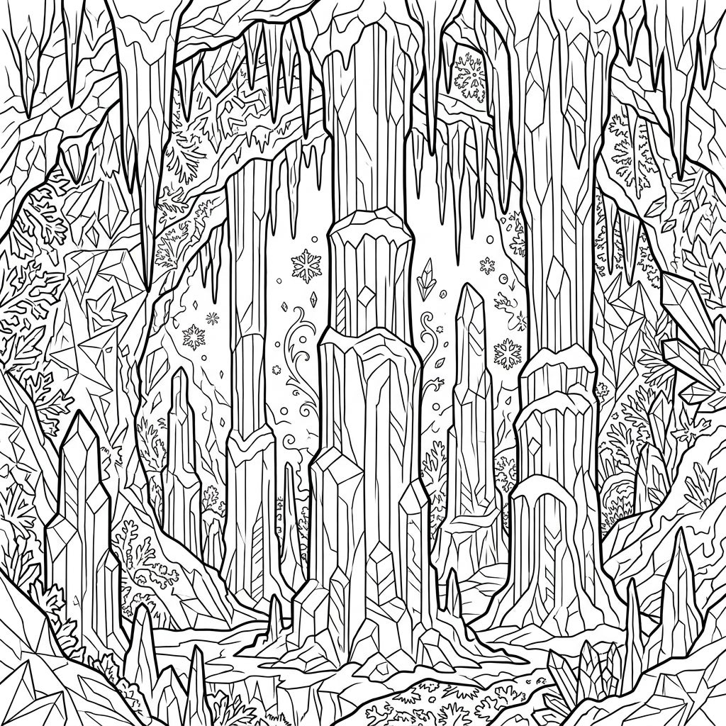 Explore a breathtaking world of frozen beauty with this intricate ice columns coloring page. Dive into a serene cave environment, perfect for unleashing your creativity with cool blues, whites, and shimmering accents.