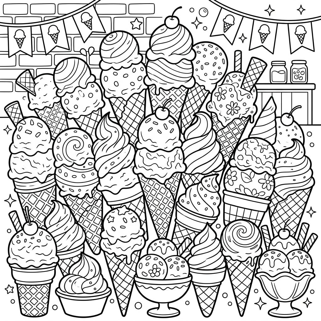 This bountiful scene isn't just about ice cream; it's about the joy, celebration, and sweet indulgence that these treats represent. Imagine a lively summer fair or a bustling ice cream parlor, beautifully rendered in line art. The full-page composition ensures there's always something new to discover, with playful elements like ice cream bunting flags and sparkling stars adding to the festive atmosphere. It's an immersive coloring experience that transports you to a world of sugary delights and happy memories.