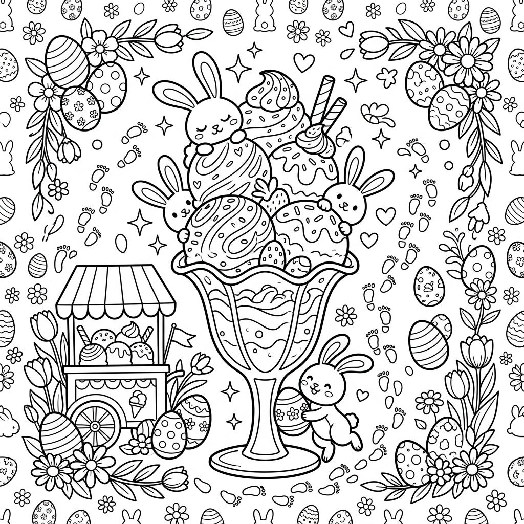 Step into a delightful Easter dream with this charming coloring page, centered around a magnificent sundae glass overflowing with various ice cream scoops. Peeking playfully from among the sweet treats are adorable bunny faces, complemented by tempting chocolate sticks and scattered sprinkles. The scene is further enriched with an abundance of intricately decorated Easter eggs, cheerful spring blossoms like tulips and daisies, and a whimsical ensemble of little rabbits enjoying the festivities. To the bottom left, a quaint ice cream cart adds an extra layer of sweetness, all rendered in beautifully clean, rounded line art.