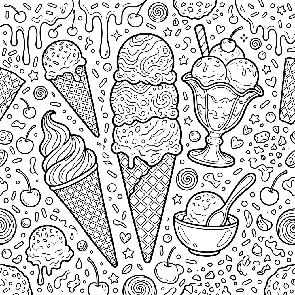 Step into a world of frosty delights with this intricately designed ice cream scoops coloring page. This delightful pattern showcases an array of your favorite frozen treats, including towering triple-scoop cones, elegant sundaes in a glass, classic single cones, and even a tempting scoop in a bowl with a spoon. Every corner of the page is adorned with playful dessert-themed elements like scattered sprinkles, juicy cherries, whimsical stars, tiny hearts, and delightful melting drips, creating a rich and engaging scene ready for your artistic touch.