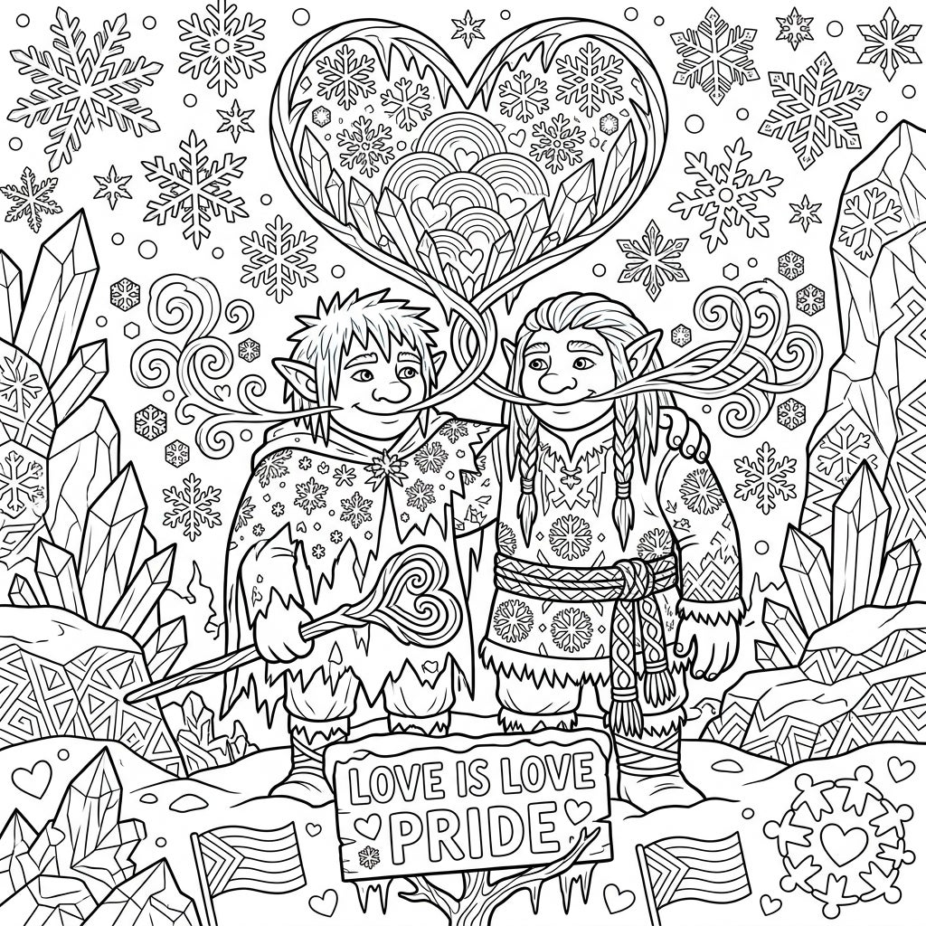 Celebrate love and diversity with this enchanting Ice Trolls Pride adult coloring page. Featuring two frosty trolls in a heartwarming embrace surrounded by intricate snowflakes and symbols, it offers a mindful and joyous coloring experience.