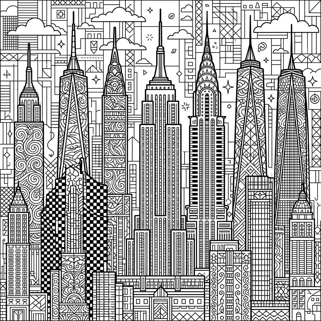 Dive into a breathtaking cityscape with this meticulously crafted coloring page, showcasing a magnificent collection of iconic skyscrapers. Each architectural marvel is rendered with astounding detail, featuring an array of intricate geometric patterns, art deco motifs, and classic building textures. The densely packed urban landscape extends across the entire canvas, complete with subtly detailed city-themed elements and fluffy clouds in the background, ensuring there are no empty spaces and every corner invites artistic exploration.