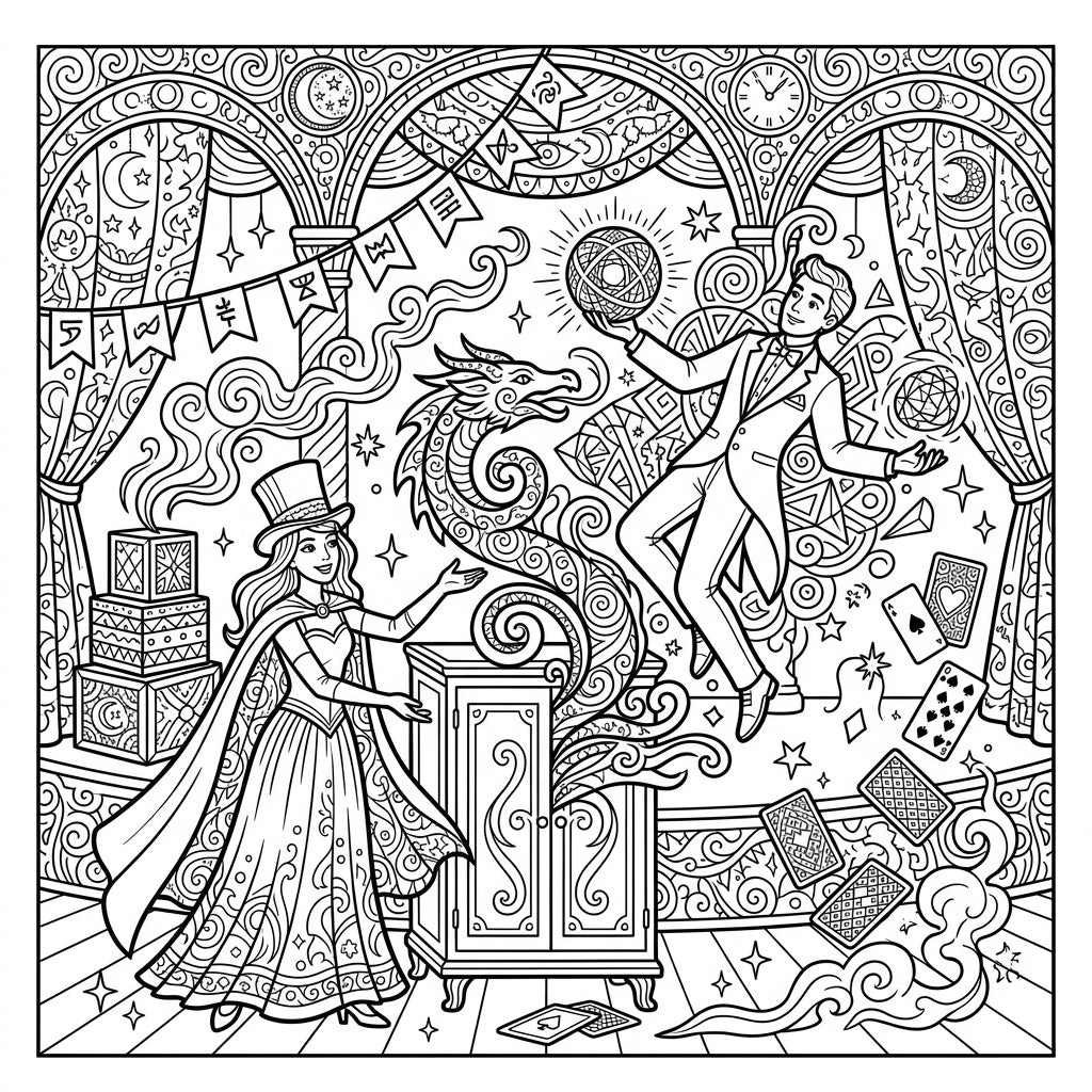 Enter the mesmerizing realm of magic with our 'Illusionists' Grand Performance' coloring page. This intricate full scene illustration captures a duo of master illusionists in their element: a charming gentleman floats effortlessly, conjuring a radiant orb, while a graceful lady in a top hat and flowing cape commands a mystical dragon-like apparition emerging from an antique wardrobe. Observe the flurry of details, from scattered playing cards dancing in the air to the ornate arched windows and draped curtains that frame their magical stage.