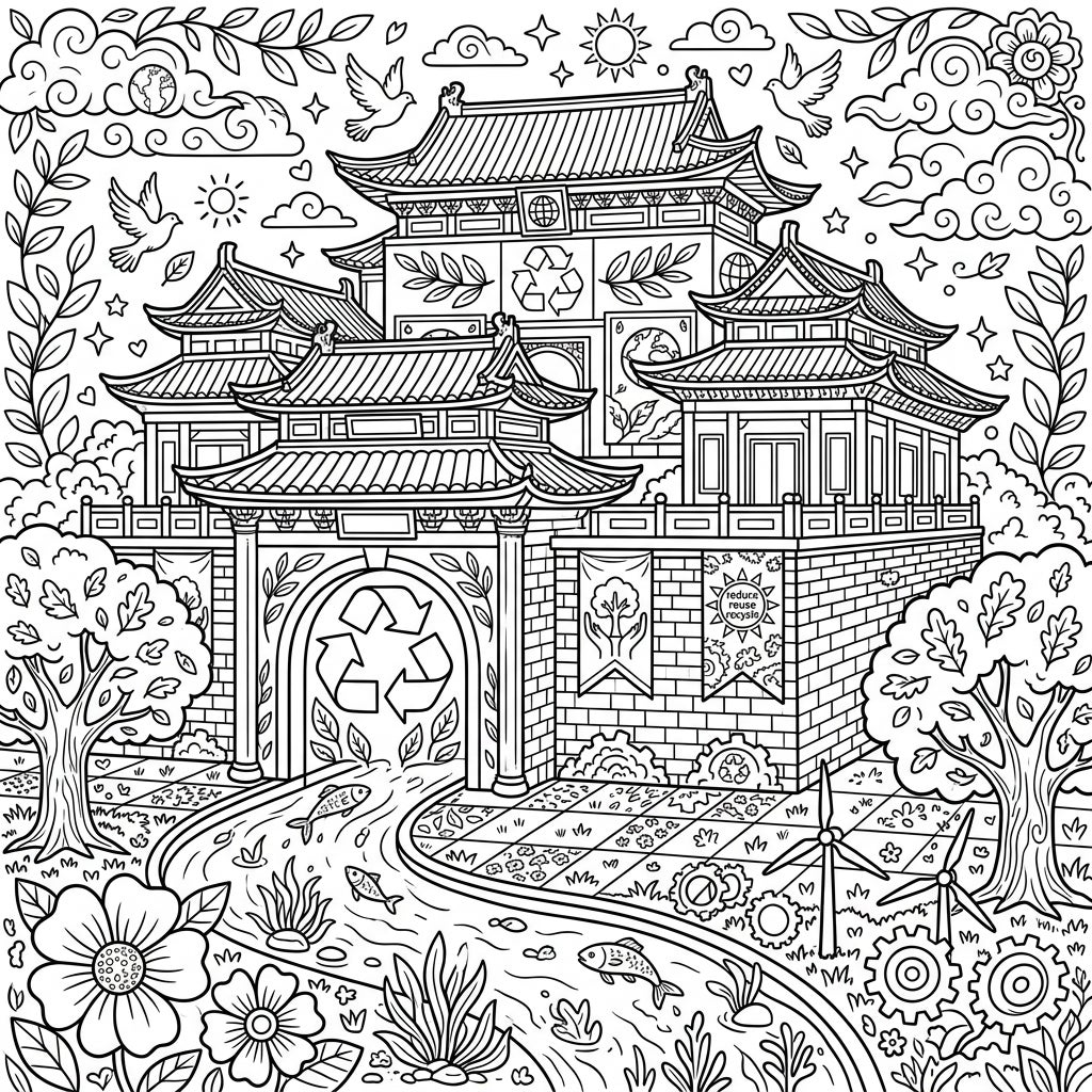 Step into a world where ancient majesty meets modern environmental consciousness with this unique Imperial Palace coloring page. This intricate design showcases a grand East Asian-style palace, complete with traditional roofs and elaborate gates, all subtly integrated with symbols of sustainability. Look closely and you'll discover prominent recycling logos adorning the palace walls, a clear nod to our planet's well-being. The foreground features a winding river teeming with fish, while wind turbines, gears, and bountiful trees frame the majestic structure, creating a harmonious blend of architectural beauty and natural preservation.