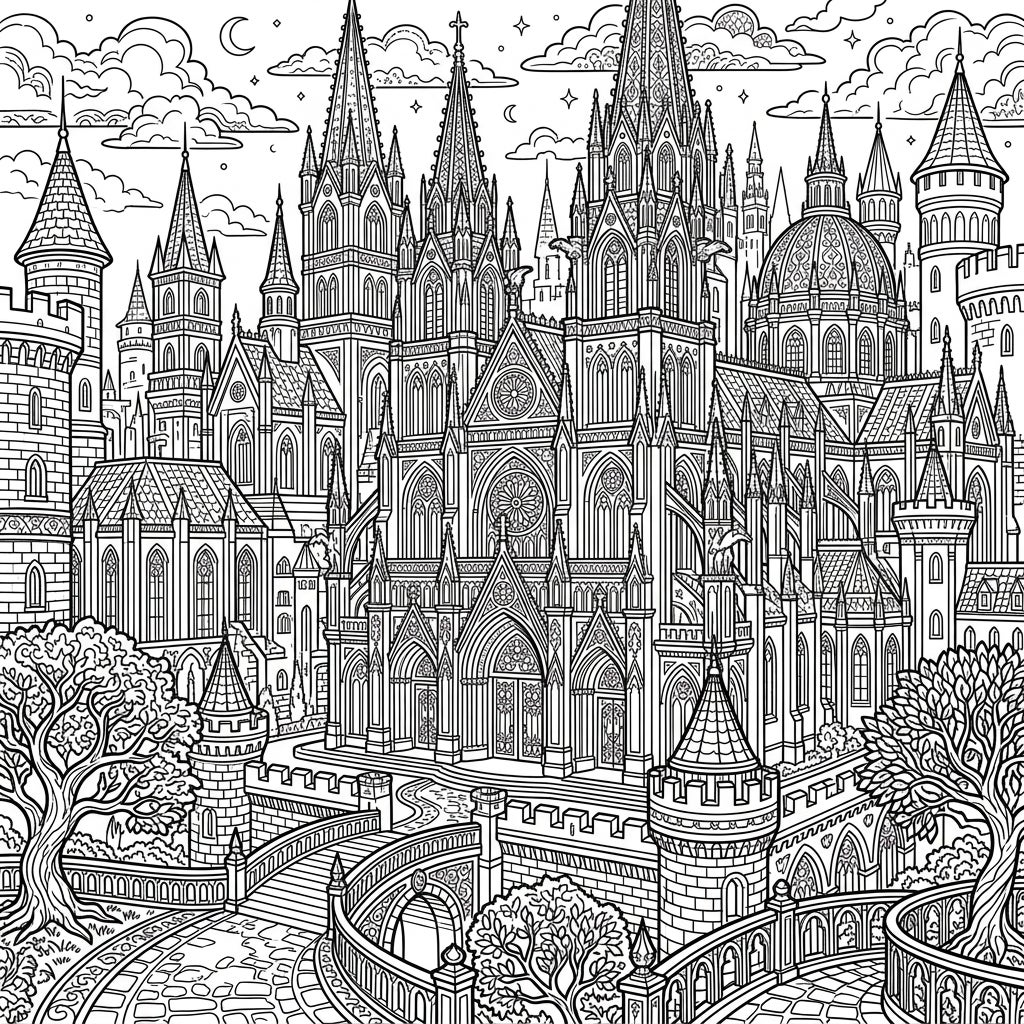 Prepare to be mesmerized by the sheer scale and intricate beauty of this Gothic Imperial Palace coloring page. This design captures a grand residence fit for emperors and empresses, rendered with an evocative dark aesthetic. Observe the towering spires reaching towards a celestial sky dotted with stylized clouds and crescent moons, hinting at a timeless, mysterious realm. Every architectural element, from the ornate arches and detailed rose windows to the fortified walls and graceful bridges, invites careful attention and a creative hand.