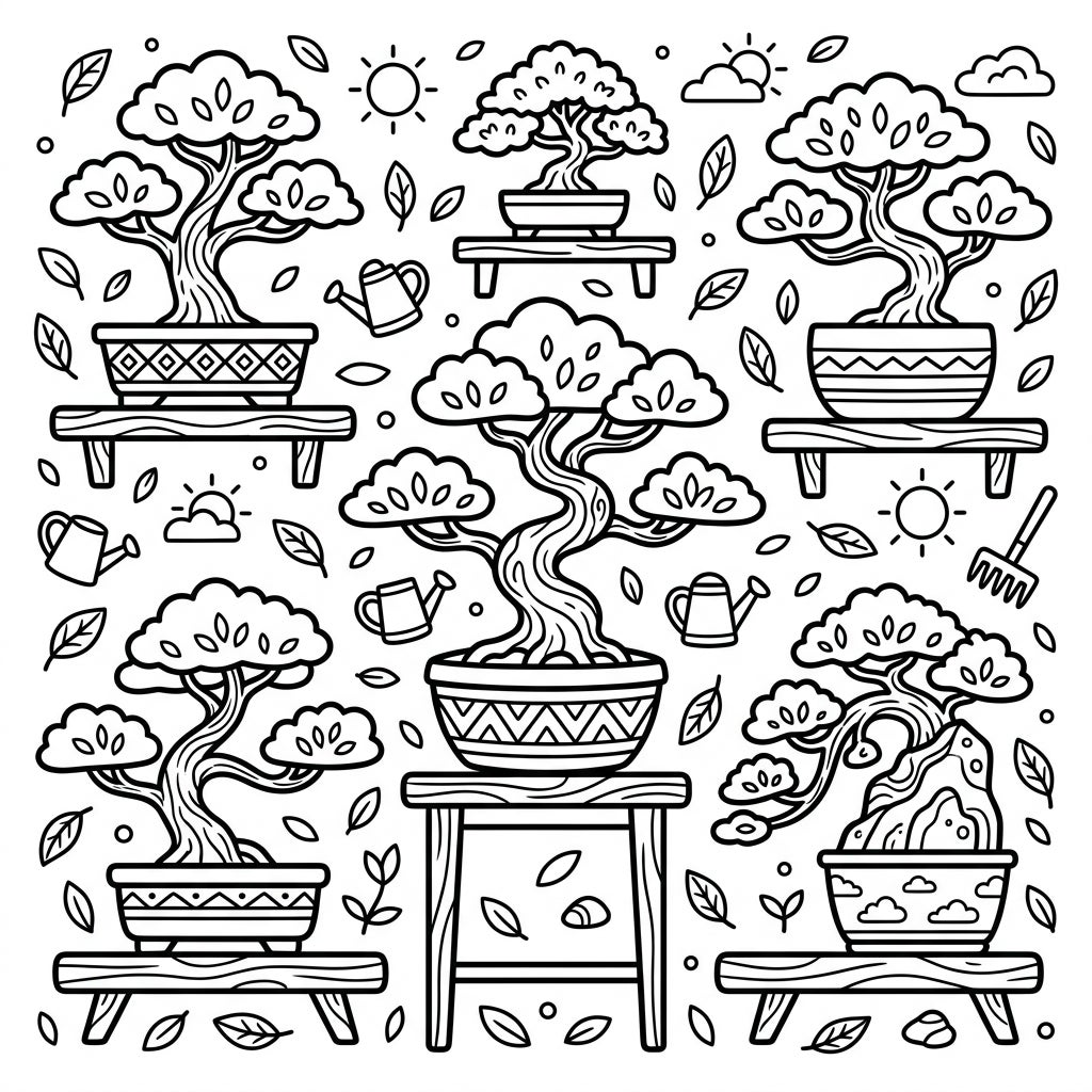 Step into a charming miniature garden with this enchanting coloring page, showcasing a delightful collection of seven indoor bonsai trees. Each tree boasts its own unique shape and intricate trunk, nestled in beautifully decorated pots, some resting on rustic wooden stands. The playful scene is completed with scattered leaves, cheerful suns, soft clouds, handy watering cans, and a little rake, inviting young artists to bring this peaceful garden to life.