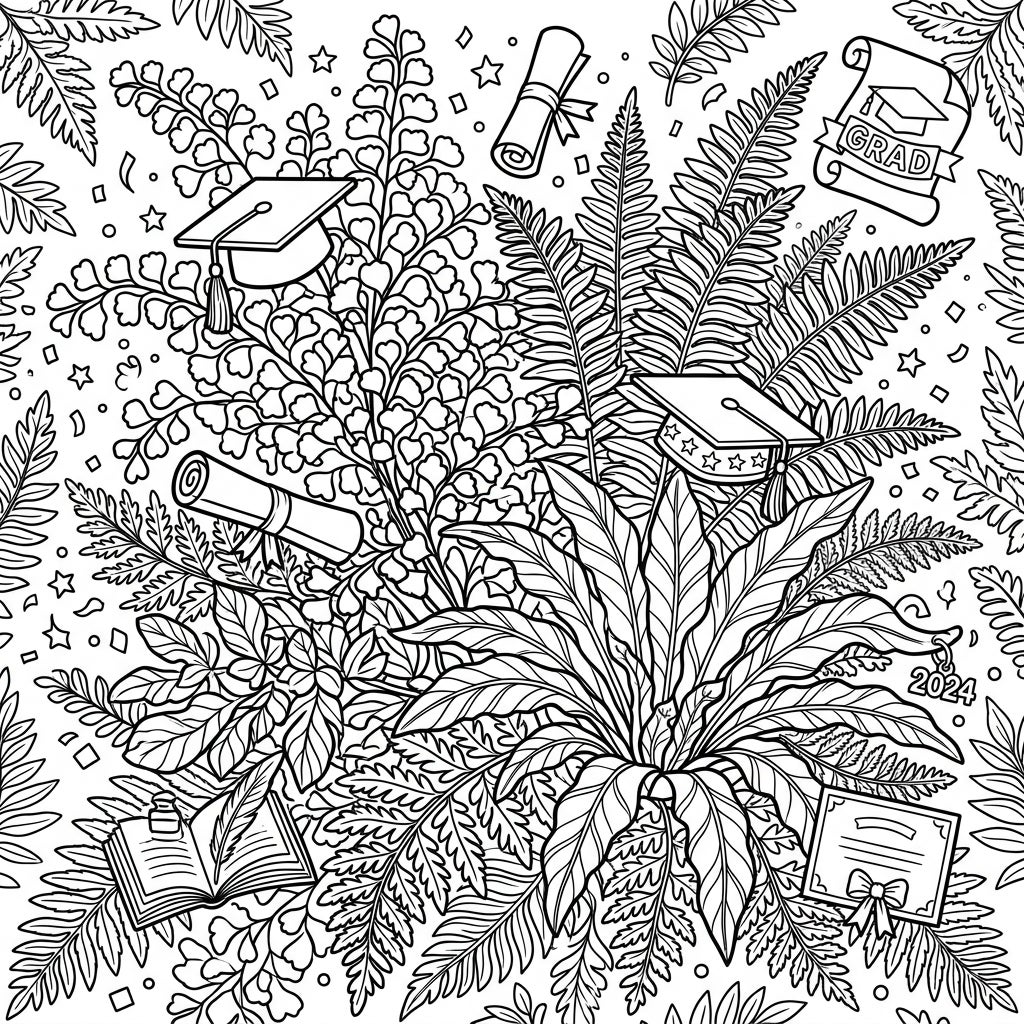 Immerse yourself in a beautiful blend of nature and achievement with this unique coloring page. Delicate indoor ferns provide a lush backdrop for festive graduation symbols, perfect for celebrating milestones.