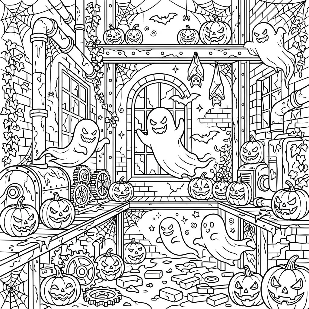 Immerse yourself in a captivating Halloween scene set within the eerie confines of abandoned industrial ruins. This densely packed coloring page invites you to explore a world where decaying brickwork, weathered pipes, and intricate gears are draped with festive fright. Discover a multitude of classic Halloween elements, including mischievous jack-o'-lanterns with their unique carved smiles, playful ghosts floating through the air, and an abundance of spooky cobwebs complete with lurking spiders and flying bats, transforming this forgotten space into a vibrant Halloween spectacle.
