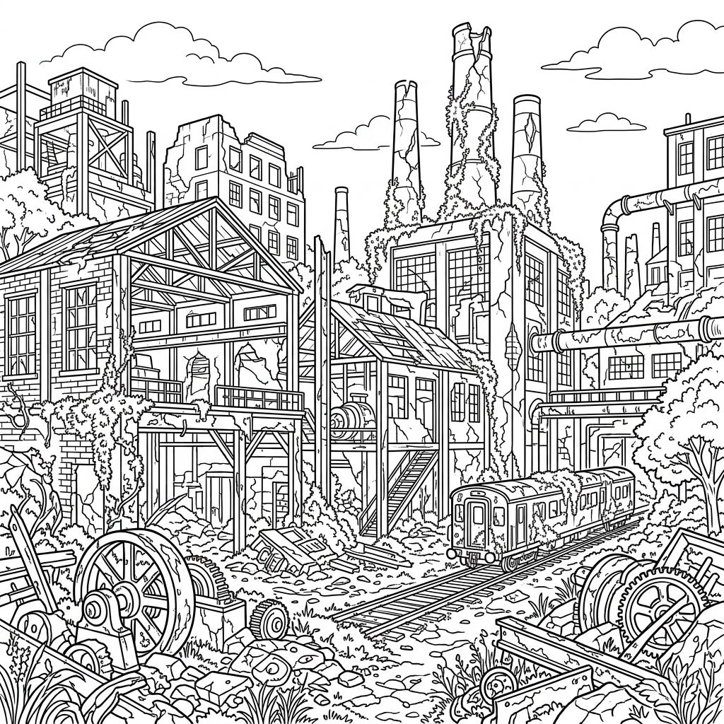 Step back in time with this captivating coloring page featuring a detailed scene of abandoned industrial ruins. Designed specifically for seniors, its clear lines and mature themes offer a relaxing and cognitively stimulating artistic experience.