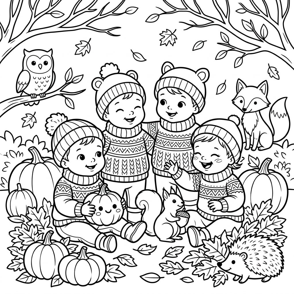 Welcome the beauty of fall with this charming coloring page featuring adorable babies dressed in cozy autumn wear. They're enjoying the season alongside their cute woodland animal friends, surrounded by pumpkins and fallen leaves.