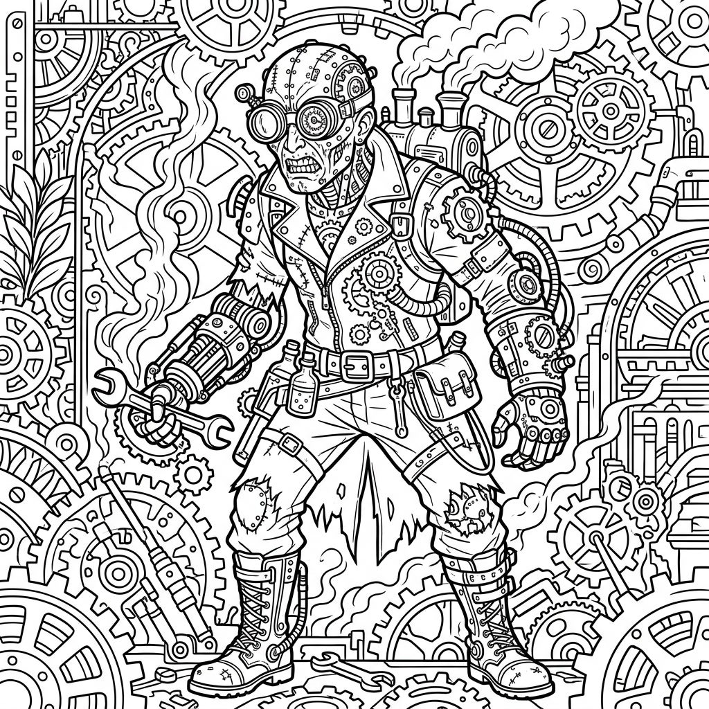 Dive into an intricate coloring template featuring a formidable 'Infected Human' reimagined through a Steampunk lens. This detailed character sports protective goggles, elaborate mechanical prosthetics, and a steam-powered backpack emitting wisps of smoke. Notice the tattered clothing adorned with gears and bolts, hinting at a desperate, yet resourceful, existence amidst industrial decay. The figure clutches a wrench, a symbol of its mechanical modifications, all set against a dense, captivating background filled with interlocking gears, pipes, and Victorian-era machinery, creating a rich tapestry of mechanical wonder.