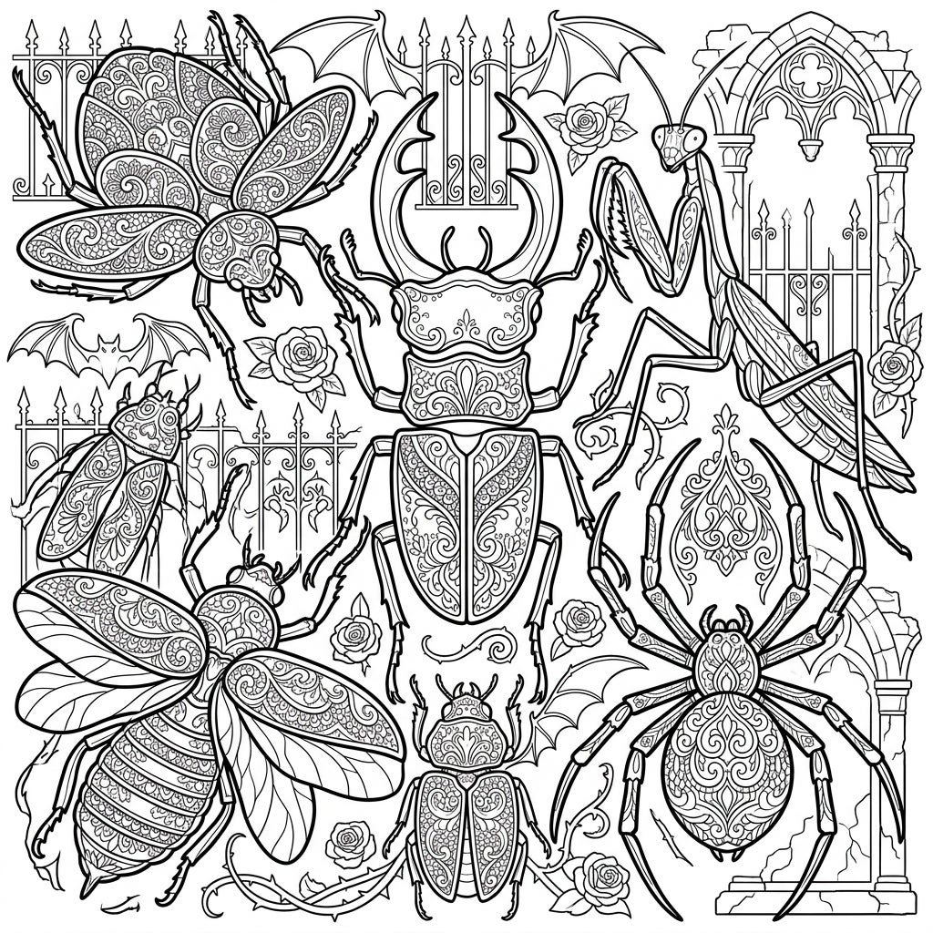 Delve into a world of mysterious beauty with this intricate coloring page, showcasing a collection of insect and arachnid exoskeletons adorned with delicate Gothic patterns. Perfect for colorists who appreciate dark elegance and detailed designs.
