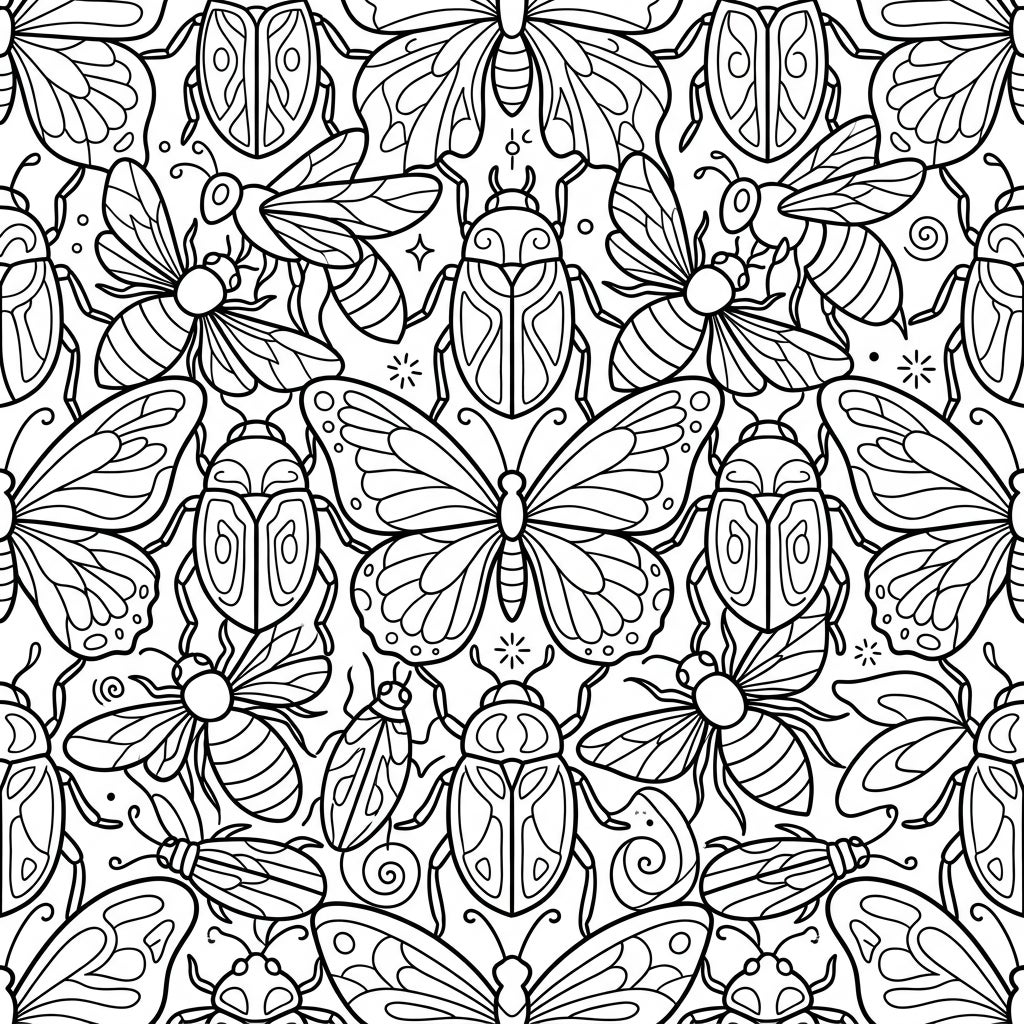 This intricate coloring template showcases a mesmerizing tessellation pattern, where a variety of friendly insects interlock to fill the entire page. Young artists will delight in discovering cheerful butterflies with detailed wings, busy bees ready to collect nectar, and charming beetles with their distinct shells, all arranged in a harmonious, repeating design that offers a rich visual experience.
