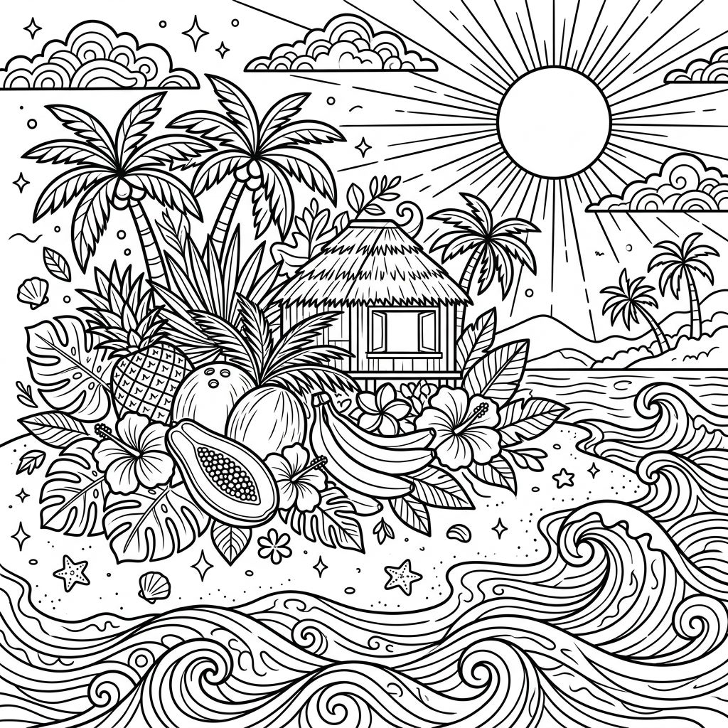 Embark on a visual journey to a stunning tropical island with this captivating coloring page. The intricate line art showcases a charming thatched hut nestled among lush palm trees, with a radiant sun beaming down from above. In the foreground, a generous bounty of tropical fruits like juicy pineapples, coconuts, ripe papayas, and a bunch of bananas are beautifully arranged, surrounded by vibrant hibiscus flowers, broad monstera leaves, delicate seashells, and playful starfish scattered on the sandy beach and in the swirling ocean waves.