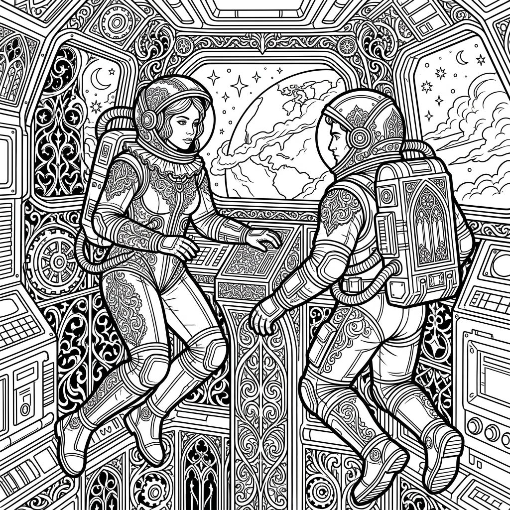 Embark on an extraordinary coloring journey with our Gothic ISS Astronauts template, merging space exploration with intricate dark aesthetics. Discover richly detailed suits and a mysterious spaceship interior, perfect for hours of creative relaxation.