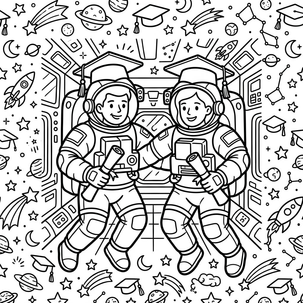 Embark on an interstellar journey of creativity with this captivating coloring page featuring two beaming ISS astronauts. Dressed in their detailed spacesuits and proudly sporting graduation caps, these trailblazers hold their hard-earned diplomas, marking a momentous occasion. The intricate design of their gear and the subtle contours of the space station interior offer a rewarding challenge for colorists of all ages.