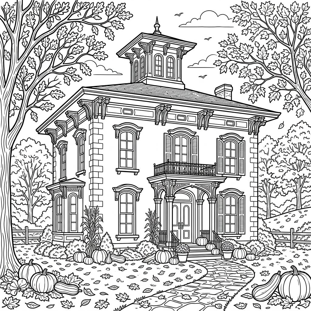 Capture the essence of autumn with this stunning Italianate mansion coloring page, intricately designed for a delightful fall coloring experience. Discover a grand architectural beauty surrounded by pumpkins, gourds, and a carpet of fallen leaves, ready for your creative touch.