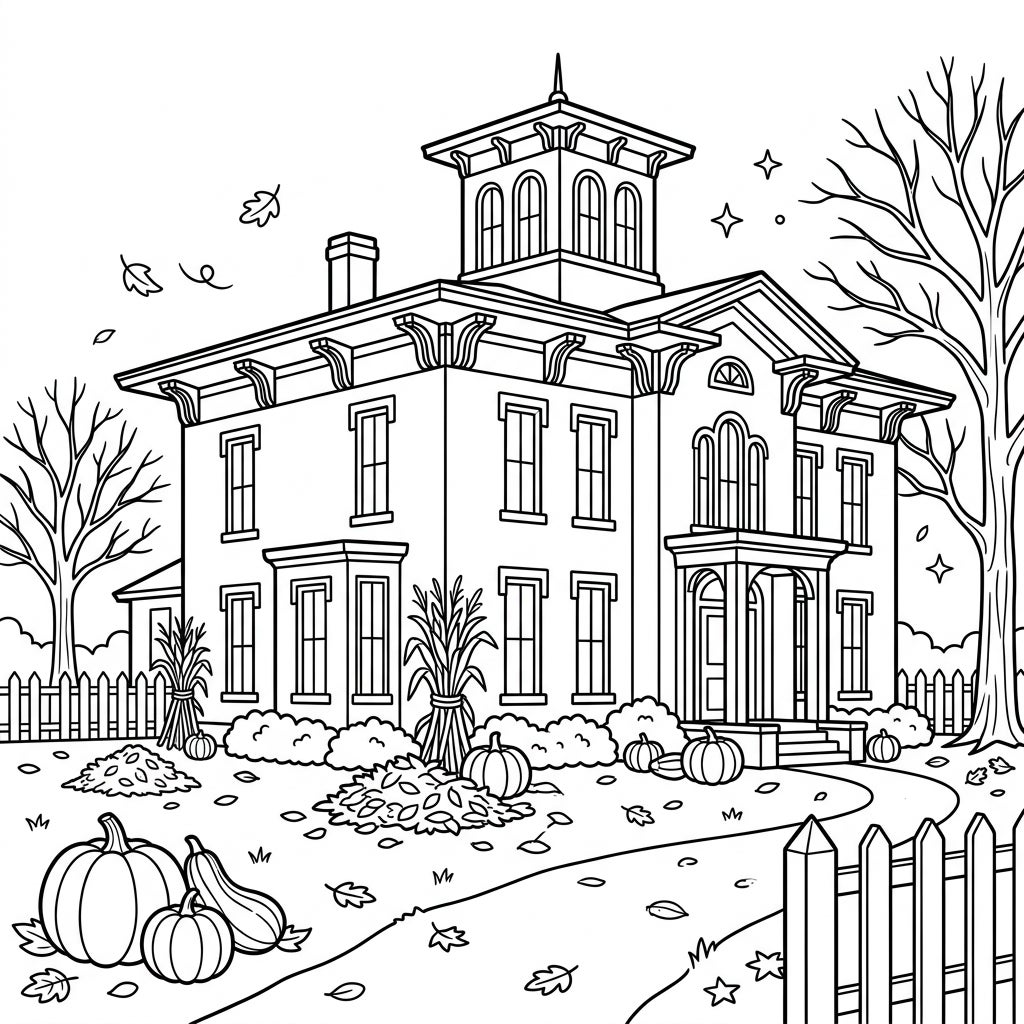 This intricate coloring template showcases a grand Italianate mansion, an architectural marvel with its distinctive low-pitched roof, wide overhanging eaves supported by decorative brackets, and a stately square cupola atop. Tall, narrow windows add to its classic appeal, while the surrounding landscape is transformed into a vibrant autumn scene. The foreground features a winding path leading to the entrance, flanked by a charming picket fence, inviting you into this picturesque setting.
