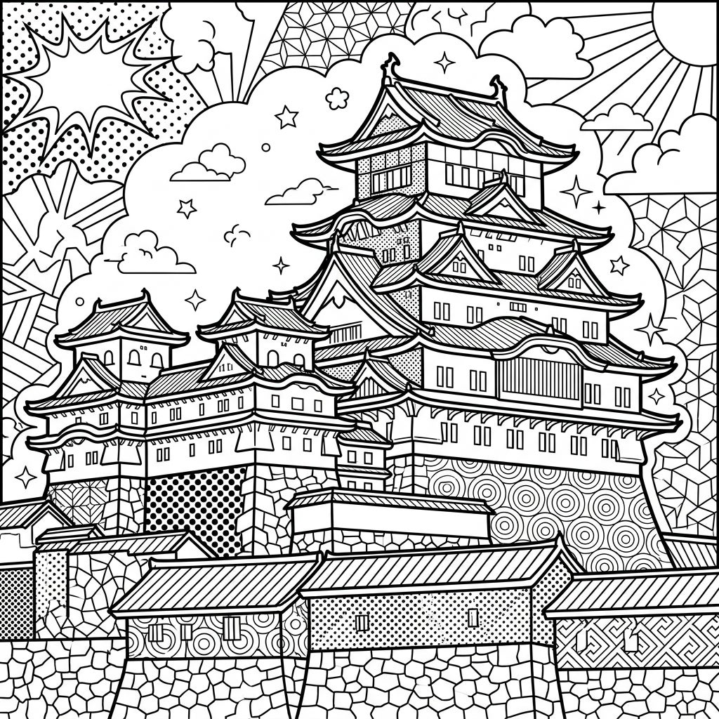 Step into a world where ancient history meets modern artistry with our Pop Art Japanese Castle coloring page. This captivating design features a majestic multi-tiered Japanese castle, complete with traditional roofs and stone foundations, all infused with the energetic and iconic aesthetic of Pop Art. Dynamic graphic elements, halftone dot patterns, and comic-book-style bursts fill the background, creating an exciting and visually stimulating scene just waiting for your vibrant touch.